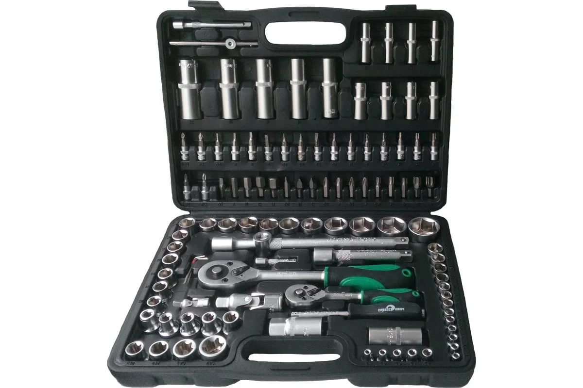 Набор инструментов «Сервис Ключ» состоит из 108 предметов и поставляется в удобном чемодане под индексом 71108. Он включает разнообразные биты, головки и ключи, что делает его универсальным для различных задач. Инструменты изготовлены из высококачественной стали, устойчивой к интенсивным нагрузкам. Каждый элемент набора имеет своё место в кейсе для удобства поиска и бережного хранения.