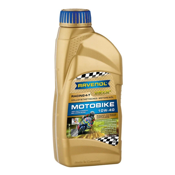 RAVENOL Racing 4-T Motobike SAE 10W-40 — это полностью синтетическое моторное масло для 4-тактных двигателей мотоциклов, созданное специально для гоночных условий с применением технологий USVO® и CleanSynto®. Оно основано на 100 % ПАО базовом масле и сложных эфирах, что делает его «полностью синтетическим» продуктом согласно законодательству Германии. Благодаря особой формуле, основанной на инновационной гоночной технологии RAVENOL, достигается идеальная синхронизация работы двигателя, трансмиссии и сцепления. Выдающиеся качества полностью синтетических базовых масел на базе ПАО и эфиров гарантируют высокую производительность и надёжную защиту от износа.