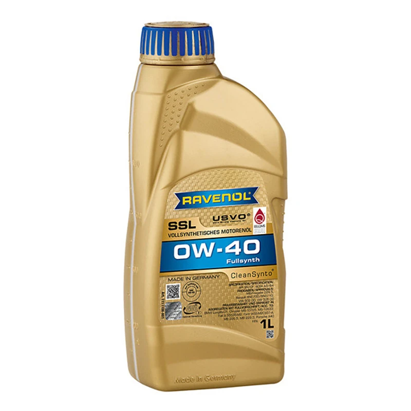 Полностью синтетическое ПАО масло RAVENOL SSL 0W-40 для легковых автомобилей Audi, BMW, Chrysler, Fiat, Mercedes-Benz, Porsche, Renault, Skoda, VW и других, требующих применения моторных масел с вязкостью SAE 0W-40 уровня качества ACEA A3/B4 с высоким щелочным числом, и эксплуатируются в условиях экстремально низких температур.
