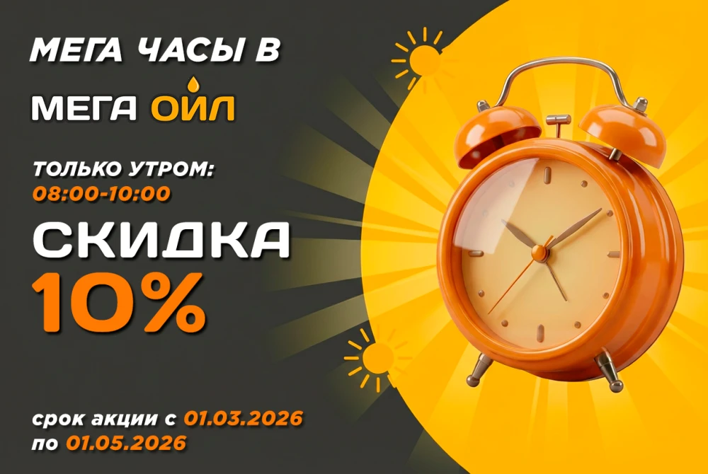 Акция «МЕГА ЧАСЫ» в сети «Мега Ойл» предоставляет скидку 10% на весь ассортимент товаров в утренние часы — с 08:00 до 10:00.